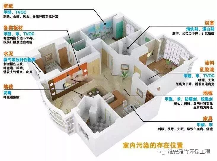 室内空气污染物主要有TVOC总挥发性有机化合物,苯系物,甲醛等,其中甲醛是室内空气污染物的最大元凶,是室内空气第一杀手,它的释放周期长达3-15年。2017年10月27日世界卫生组织国际癌症研究机构公布的致癌物清单中,甲醛被列为一类致癌物。