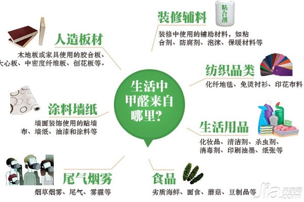 甲醛的室内来源主要有两个方面:一是燃料和烟叶的不完全燃烧;二是建筑装饰材料,装饰物品及生活日用等化工产品。目前工业上使用的黏合剂基本都是脲醛树脂,而脲醛树脂是由尿素、甲醛和树脂进行熬制而成的,所以凡是使用黏合剂的材料都会释放游离态的甲醛。包括:各种人造板材、石膏板、化纤地板、塑料地板、油漆涂料、墙纸、窗帘、布艺家具等。